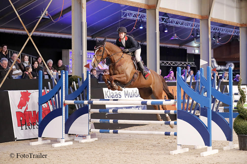 De Voermeesters spring cup finale klasse L is gewonnen door Loïs Joosse en haar paard Bellevue (v. Damiro). Ze bleven foutloos in het basis parcours en zette in de barrage een snelle tijd neer van 32 seconde.
